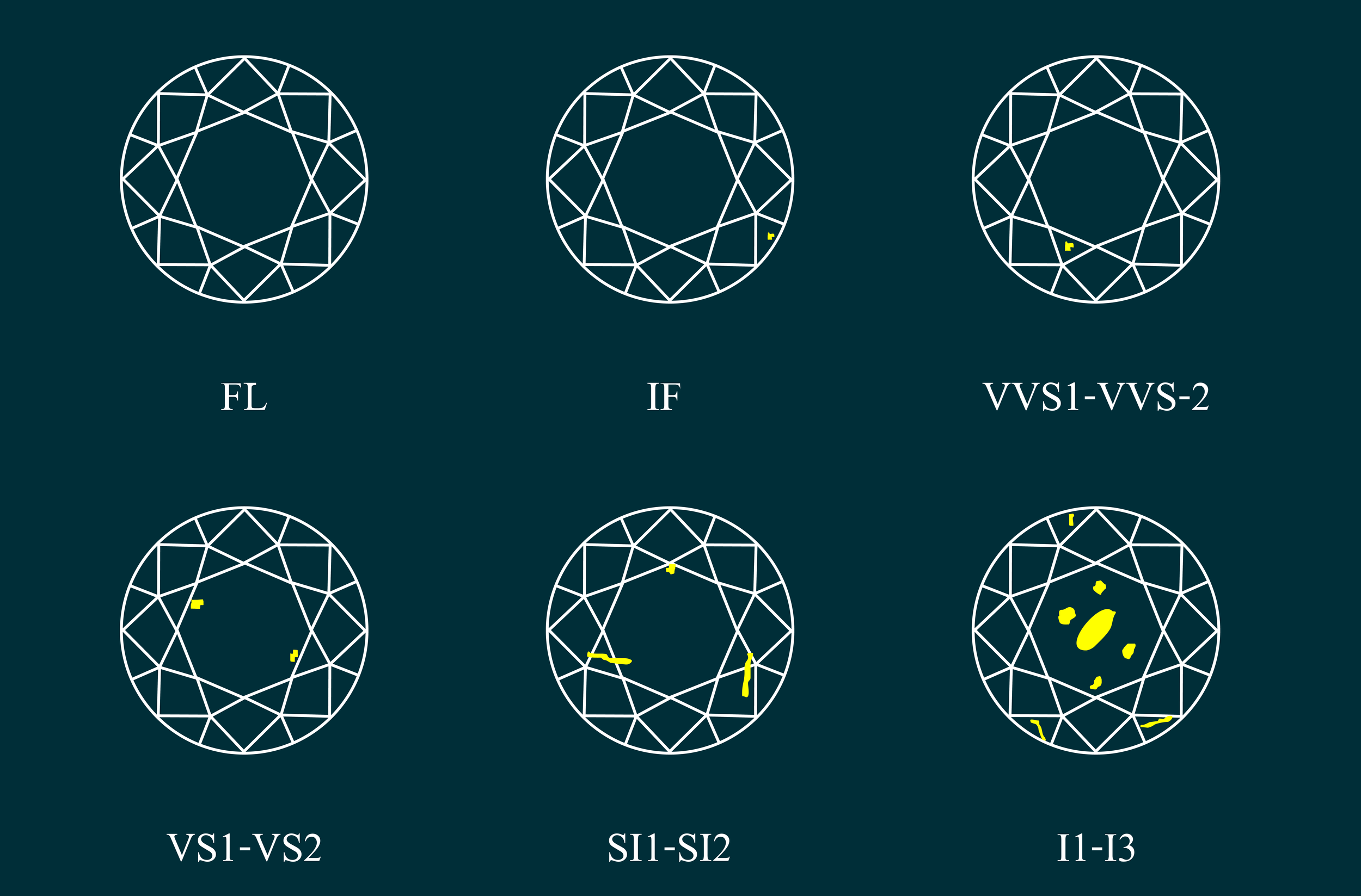 Clarity refers to the inclusions and blemishes (or absence of) within a diamond; imperfections that are present, that may or may not be visible to the naked eye. How this is measured can be seen on the images below. Whilst a Flawless (IF) diamond is as rare as hens teeth, this is where the scale starts, moving all the way down to Included (I).